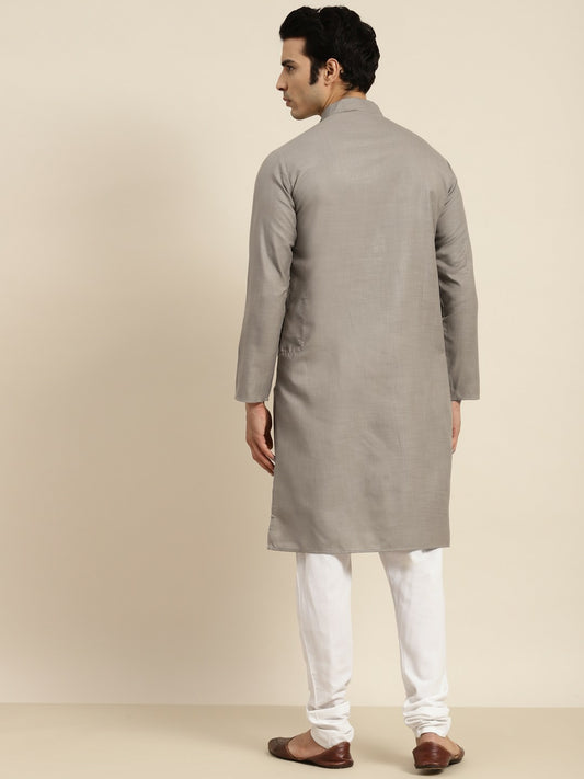 Men’s Grey Solid Kurta – Mandarin Collar, Knee-Length Cotton Kurta | Indiaista