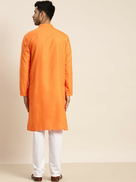 Men's Orange Solid Kurta – Mandarin Collar, Knee Length, Regular Cotton | Indiaista