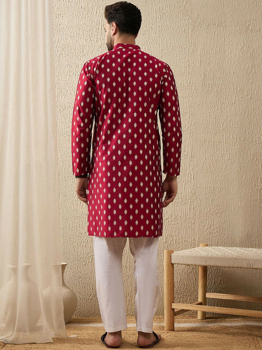 Men's Red Solid Kurta – Mandarin Collar, Regular Cotton, Knee-Length Ethnic Wear | Indiaista