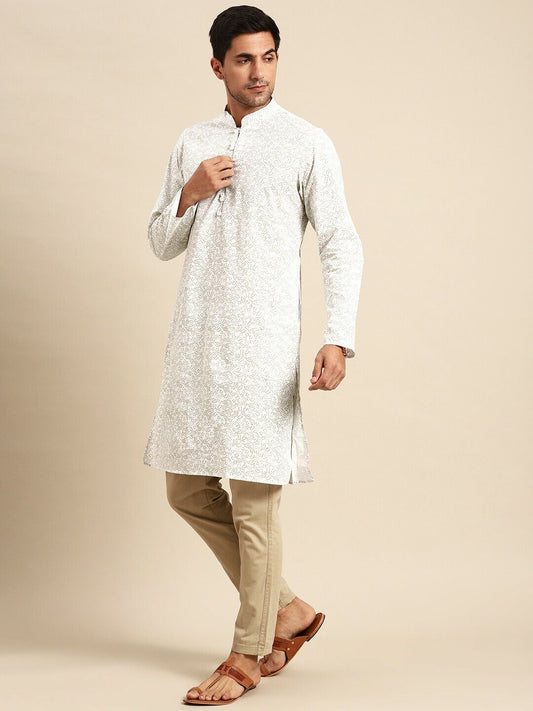 Men’s White Geometric Chikankari Kurta – Pure Cotton, Mandarin Collar