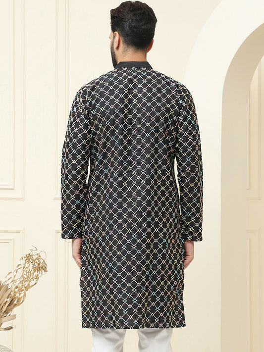 Indiaista Men’s Black Geometric Embroidered Sequinned Kurta – 100% Cotton