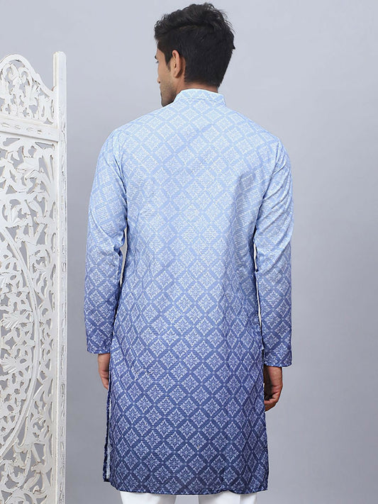Men’s Blue Ethnic Print Kurta – Pure Cotton with Mandarin Collar