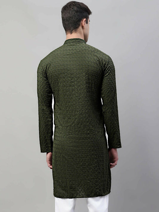 Men’s Olive Green & White Mirror Work Kurta with Geometric Embroidery | indiaista