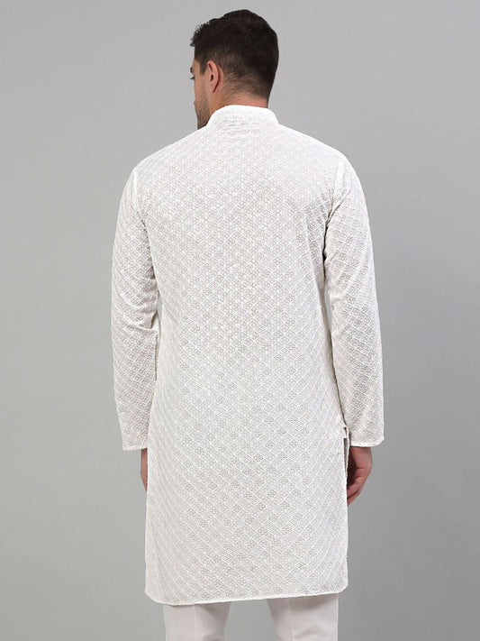 Men’s White Geometric Embroidered Cotton Kurta with Sequin Highlights