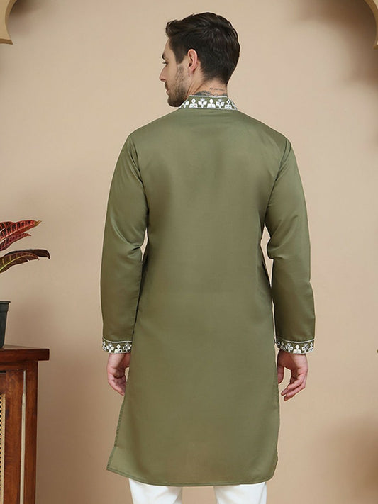 Men’s Olive Green Embroidered Cotton Kurta – Mandarin Collar, Pure Cotton
