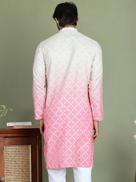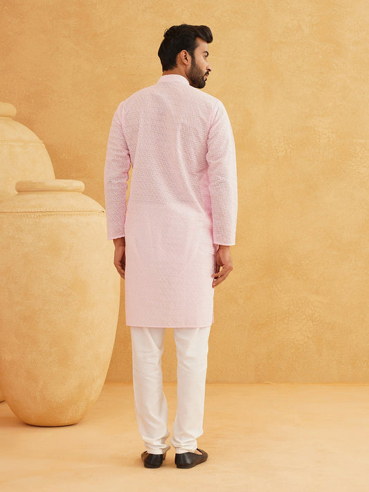 Men's Pink Floral Embroidered Kurta – Mandarin Collar, Thread Work, Knee-Length | Indiaista