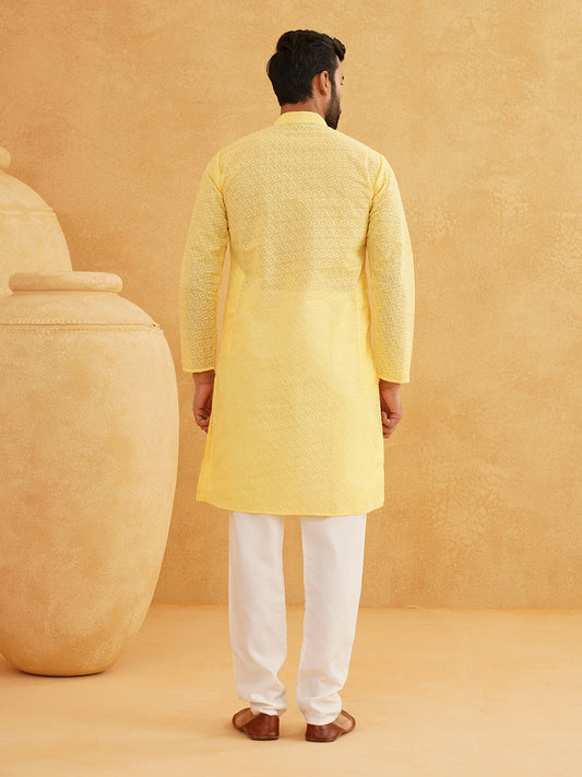 Men’s Yellow Geometric Chikankari Kurta – Pure Cotton, Mandarin Collar