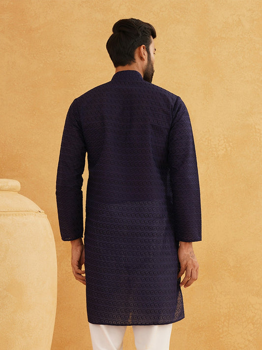 Men’s Navy Blue Woven Design Kurta – Mandarin Collar, Cotton, Knee-Length | Indiaista