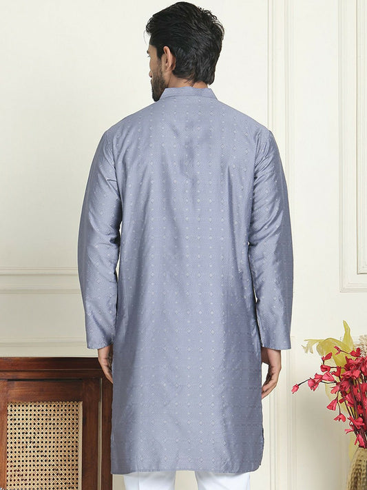 Grey Geometric Jacquard Silk Blend Kurta with Mandarin Collar