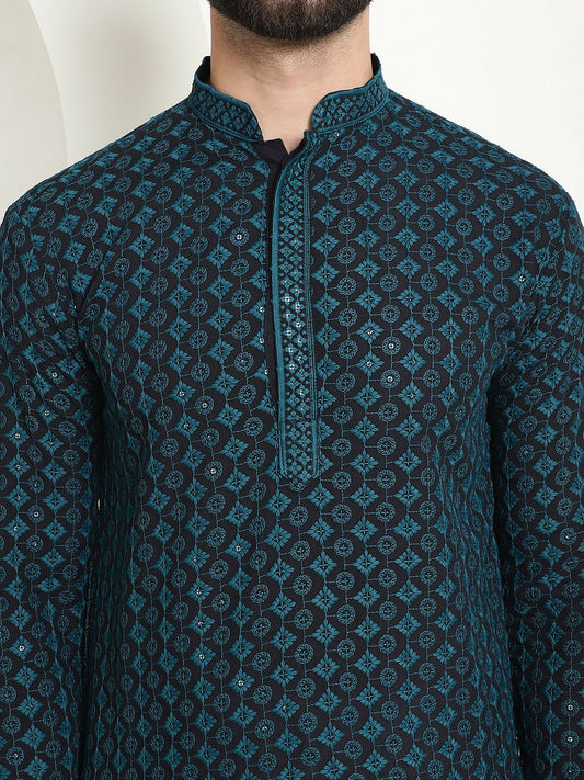 Teal Geometric Embroidered Sequinned Kurta for Men – Mandarin Collar, Pure Cotton, Knee Length | Indiaista