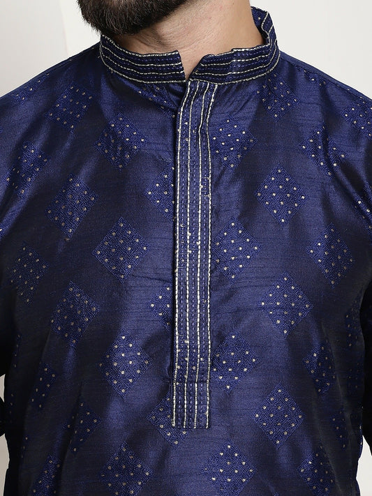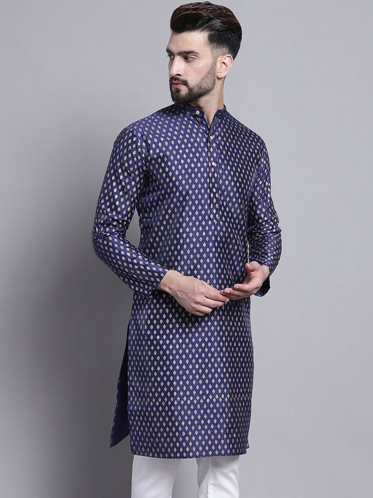 Men’s Navy Blue & Gold-Toned Jacquard Silk Embroidered Kurta – Mandarin Collar, Knee Length | Indiaista
