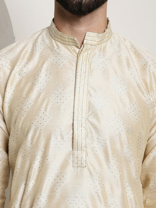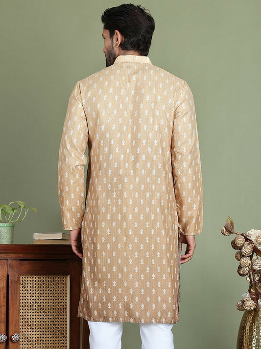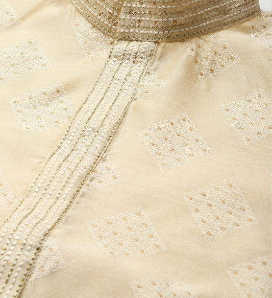 Men’s Beige & Golden Ethnic Motifs Jacquard Silk Kurta – Mandarin Collar, Knee Length, Regular Fit | Indiaista