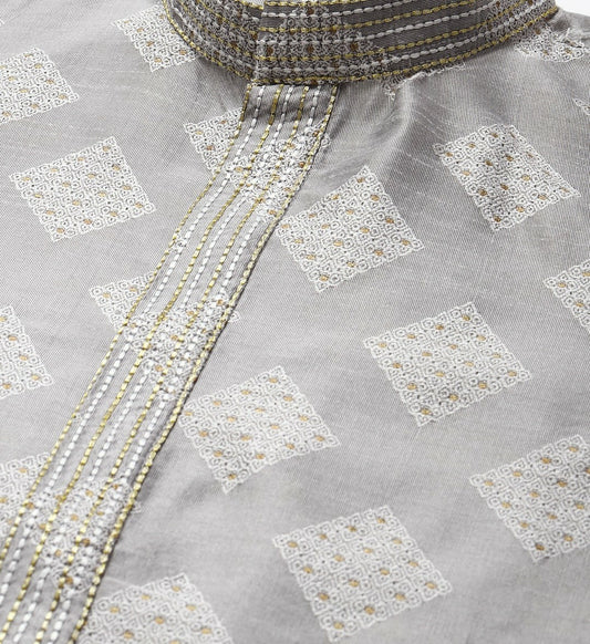 Men's Grey & Golden Jacquard Silk Kurta – Ethnic Woven Design with Mandarin Collar | Indiaista