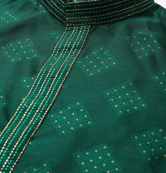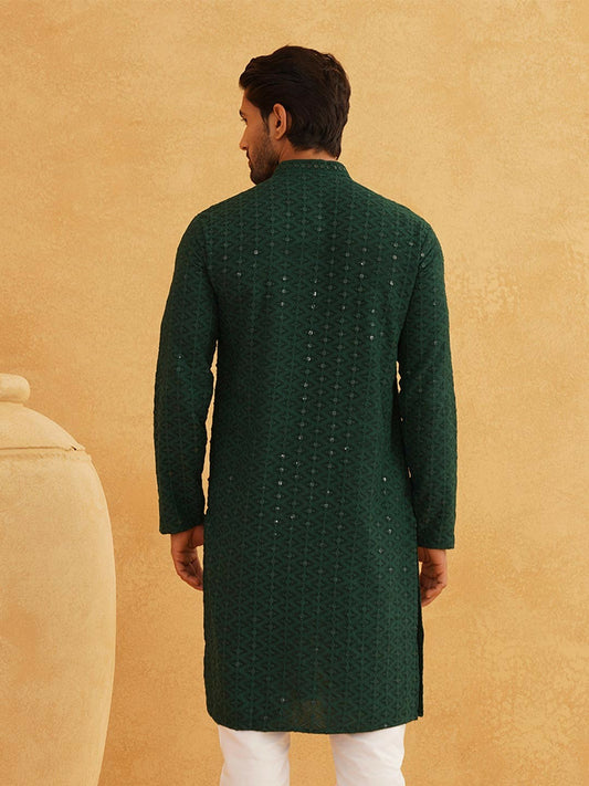 Green Men’s Ethnic Motifs Embroidered Kurta – Mandarin Collar, Sequined Detail, Pure Cotton | Indiaista