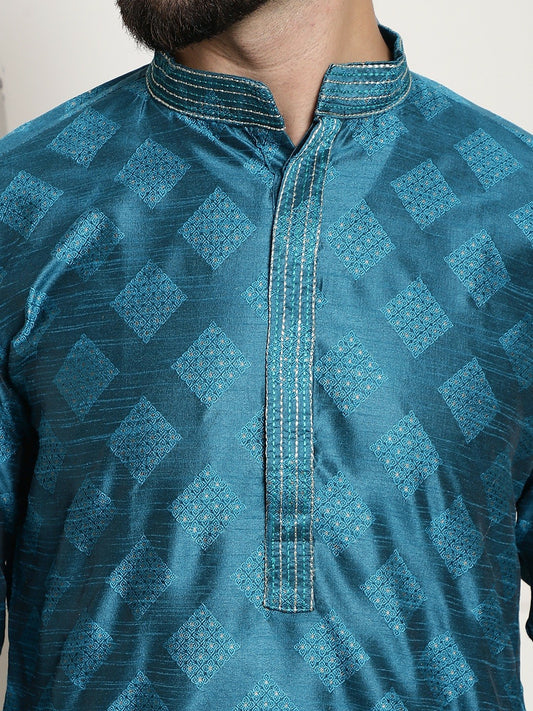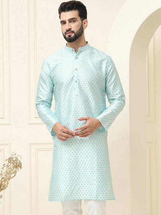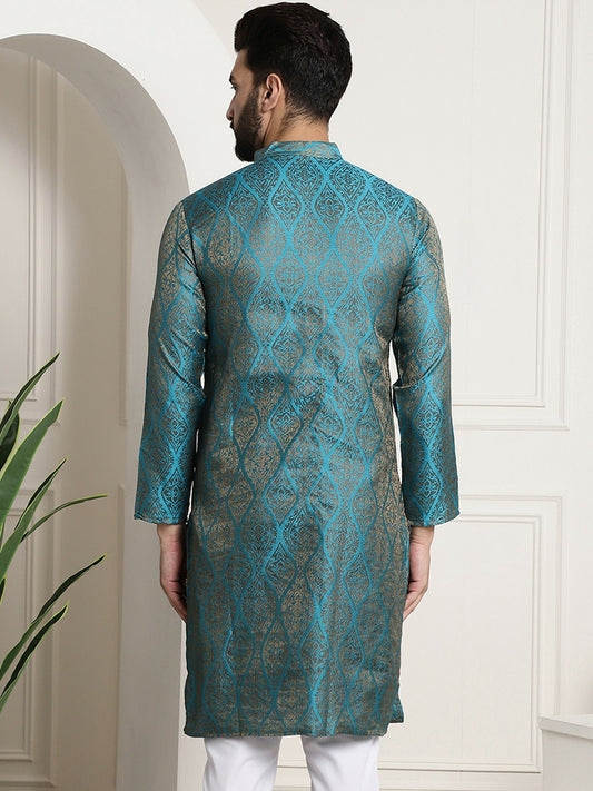 Men’s Teal Blue & Golden Jacquard Silk Kurta – Ethnic Motifs, Mandarin Collar, Knee Length | Indiaista