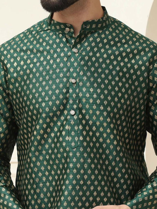Men's Green Woven Design Kurta – Mandarin Collar, Silk Cotton, Thread Work | Indiaista