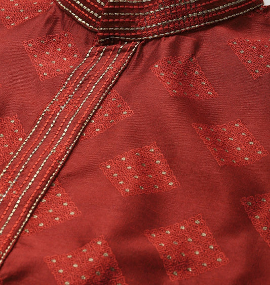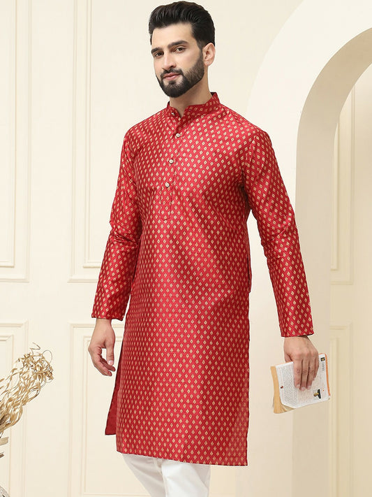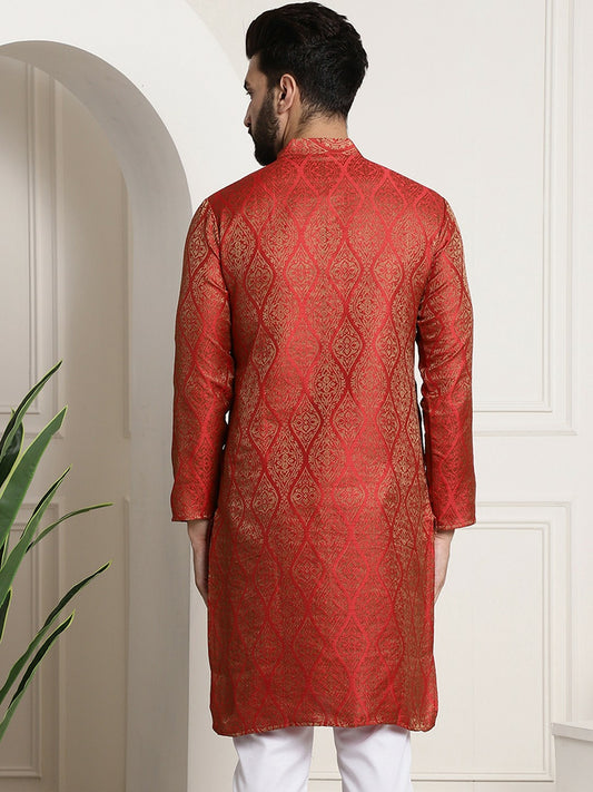 Men's Red & Golden Jacquard Silk Kurta – Ethnic Motifs, Mandarin Collar, Knee Length | Indiaista