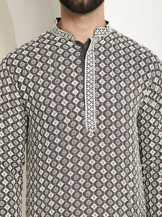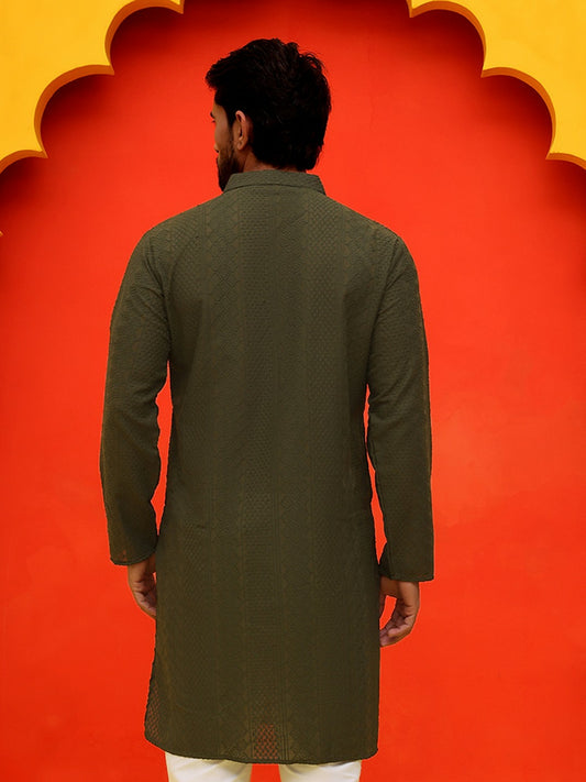 Men’s Olive Green Chikankari Kurta – Geometric Embroidery, Pure Cotton