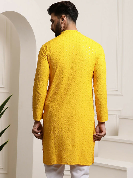 Mustard Yellow Men’s Ethnic Kurta with Embroidered Motifs & Sequins – Mandarin Collar, Pure Cotton | Indiaista