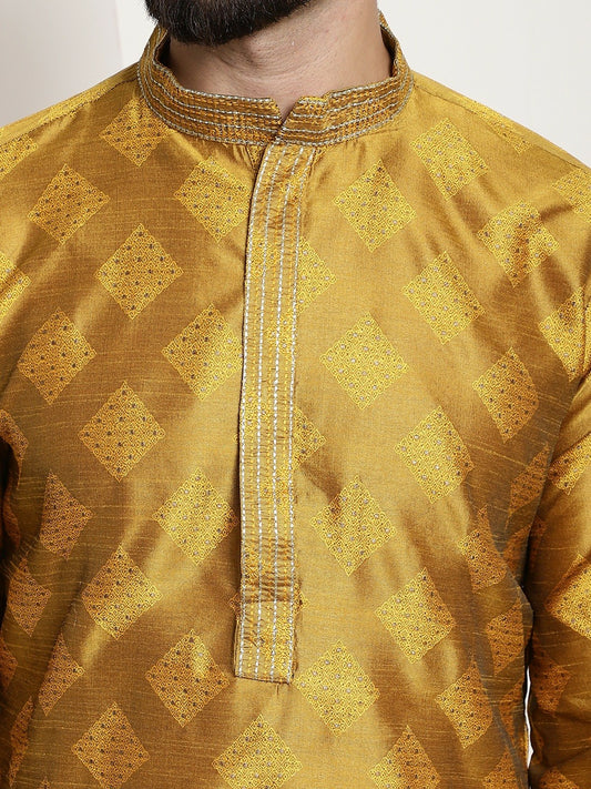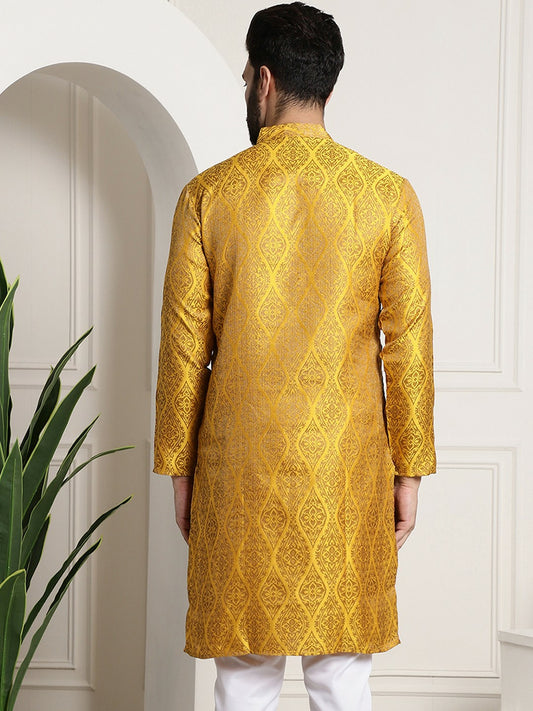Men's Mustard Yellow & Golden Jacquard Silk Kurta with Ethnic Motifs – Mandarin Collar, Knee-Length | Indiaista