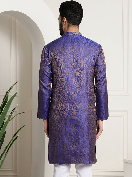 Men's Blue & Golden Jacquard Kurta with Ethnic Motifs – Mandarin Collar, Knee-Length, Cotton Silk | Indiaista