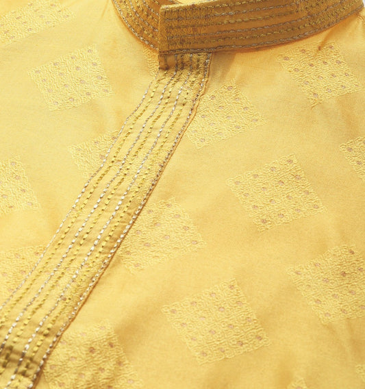 Men's Yellow & Golden Ethnic Motifs Kurta – Mandarin Collar, Silk Fabric, Knee-Length | Indiaista