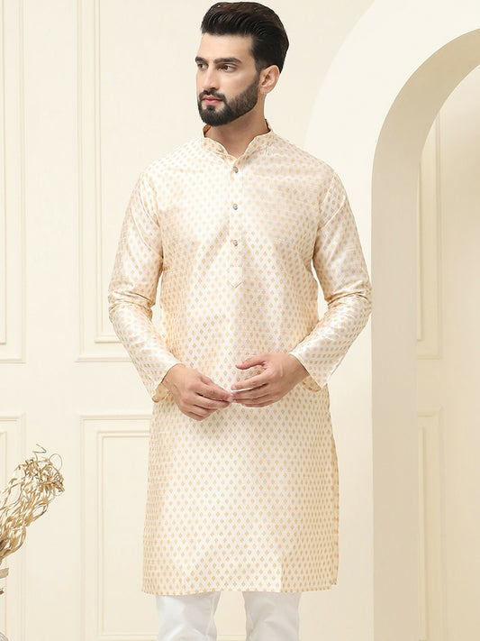 Men's Cream-Coloured & Golden Ethnic Motifs Kurta – Mandarin Collar, Silk Fabric, Knee Length | Indiaista