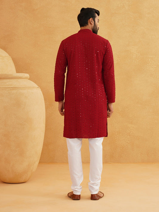 Men's Maroon Ethnic Kurta with Embroidered Motifs & Sequins – Mandarin Collar, Cotton | Indiaista