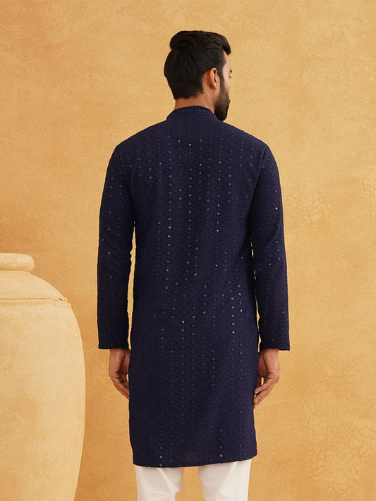 Men’s Navy Blue Self-Design Thread Work Kurta – Mandarin Collar, Cotton, Knee Length | Indiaista
