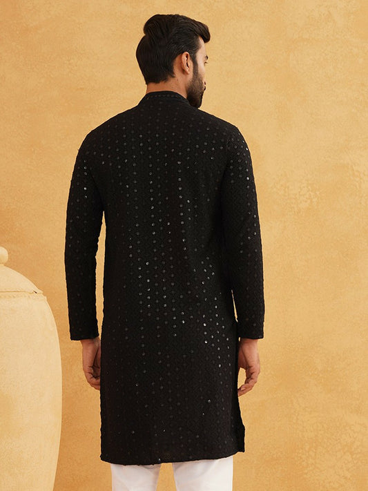 Men’s Black Self-Design Thread Work Mandarin Collar Kurta – Regular Cotton, Above Knee, Solid Color