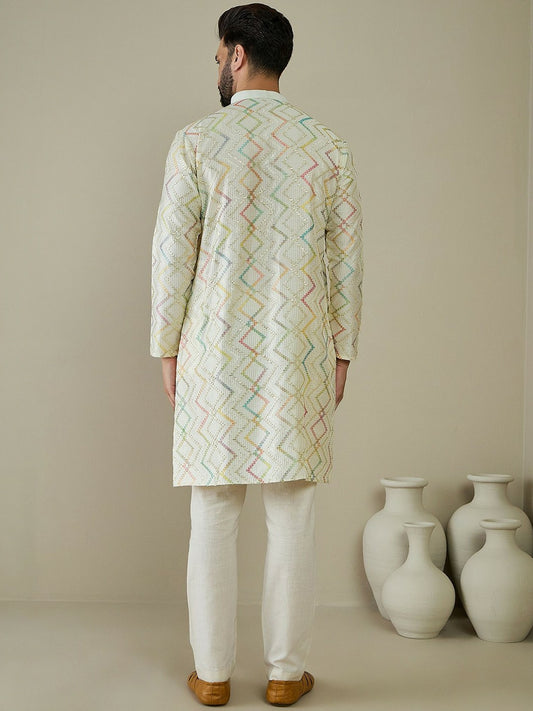 Men’s Off-White Geometric Embroidered Kurta with Sequin Detail