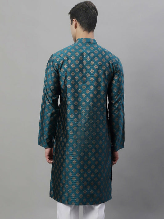 Teal Blue Ethnic Motif Woven Jacquard Kurta with Band Collar