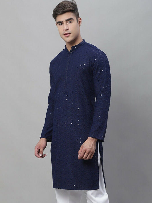 Men’s Navy Blue Embroidered Kurta with Mirror Work & Pockets