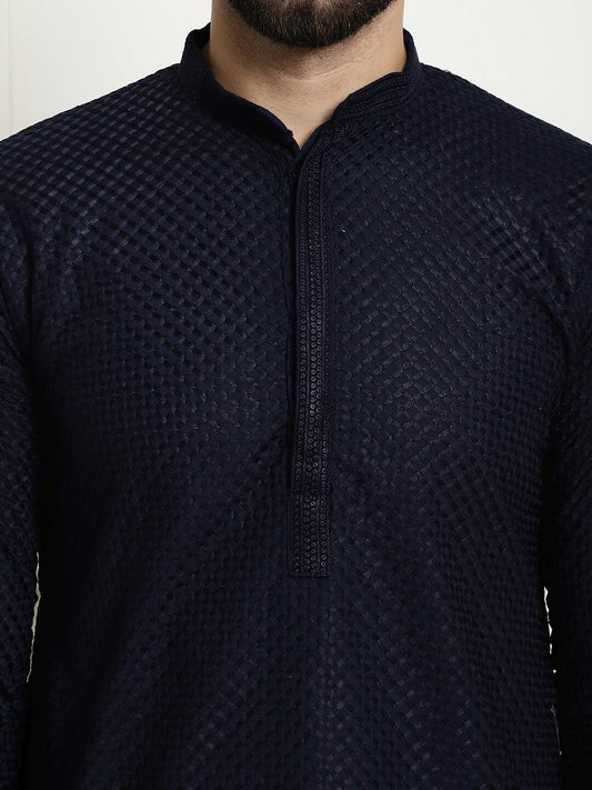 Navy Blue Geometric Embroidered Men's Kurta – Mandarin Collar, Thread Work, Cotton, Knee Length | Indiaista