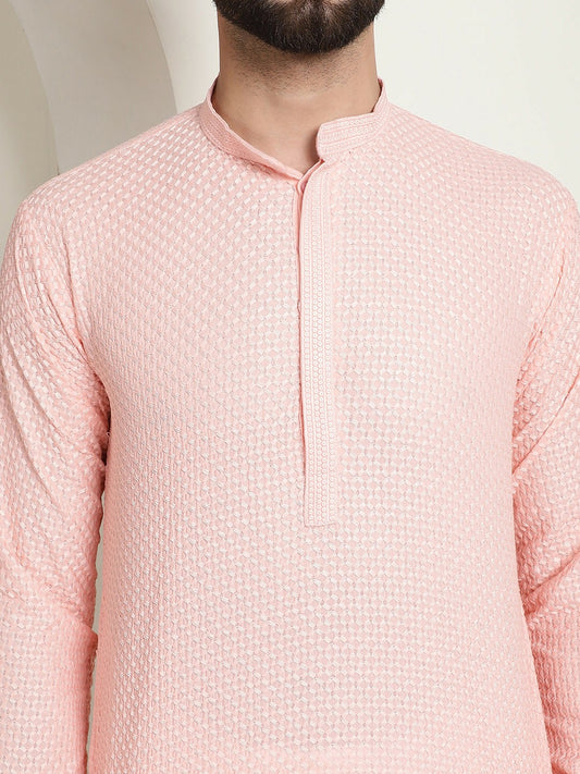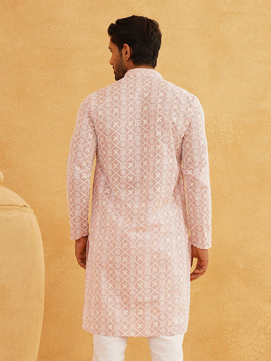 Men’s Pink Geometric Embroidered Kurta with Mirror Work & Pockets