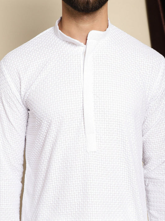 Men’s White Geometric Embroidered Mandarin Collar Kurta – Pure Cotton, Straight Fit, Above Knee | Indiaista