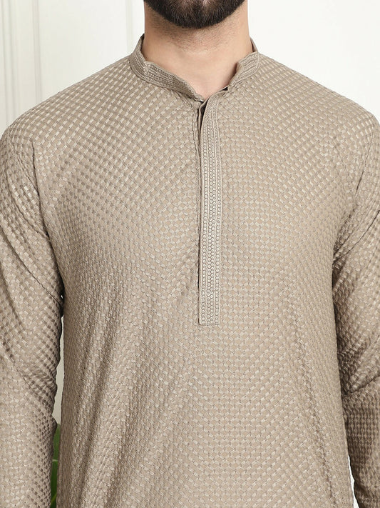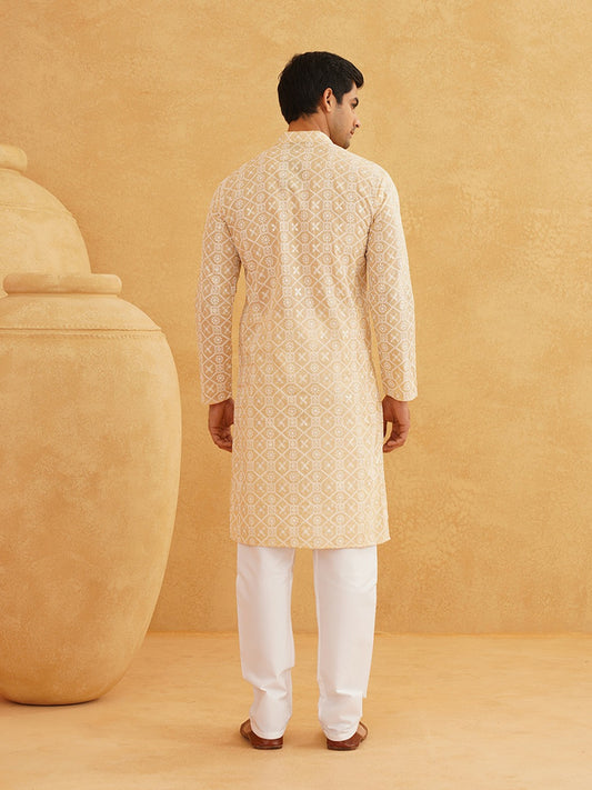 Men’s Beige Ethnic Motifs Embroidered Kurta – Mandarin Collar, Thread Work, Cotton, Knee Length | Indiaista