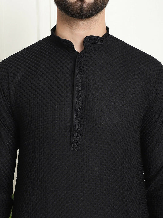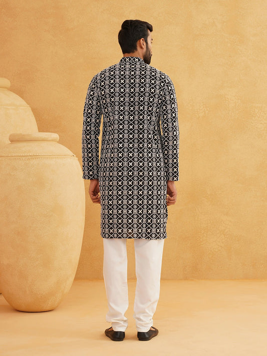 Men's Black Geometric Embroidered Pure Cotton Kurta – Mandarin Collar, Regular Fit, Knee Length | Indiaista