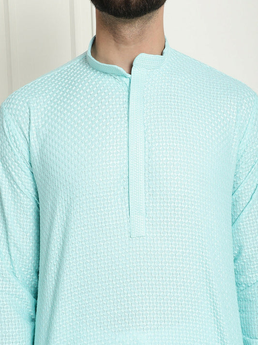 Turquoise Blue Geometric Embroidered Kurta for Men – Pure Cotton, Mandarin Collar, Knee-Length | Indiaista