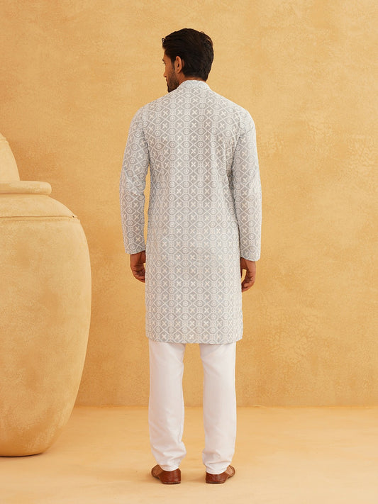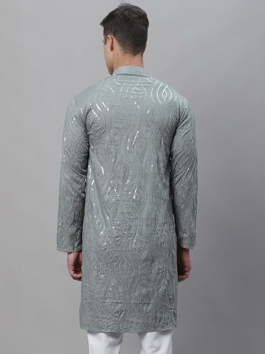 Men's Grey Ethnic Motif Embroidered Kurta with Sequined Work – Mandarin Collar, Pure Cotton | Indiaista