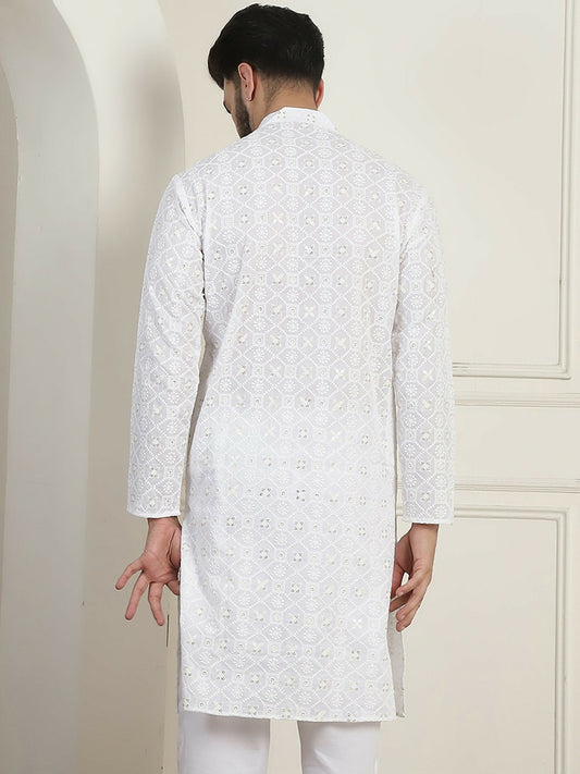 Men's White Ethnic Motifs Embroidered Kurta with Mandarin Collar & Sequins – Pure Cotton, Knee-Length | Indiaista