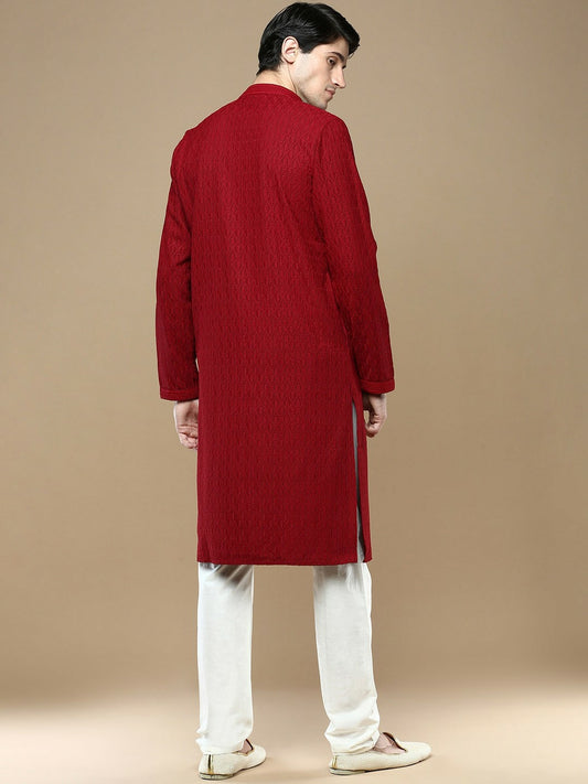 Maroon Striped Woven Kurta with Chikankari Thread Work