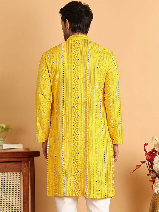 Men’s Yellow Embroidered Kurta with Mirror Work