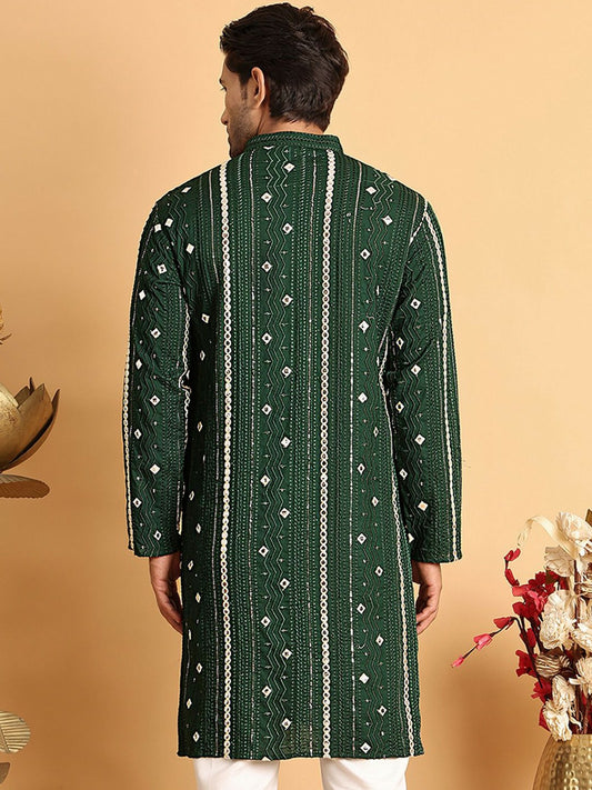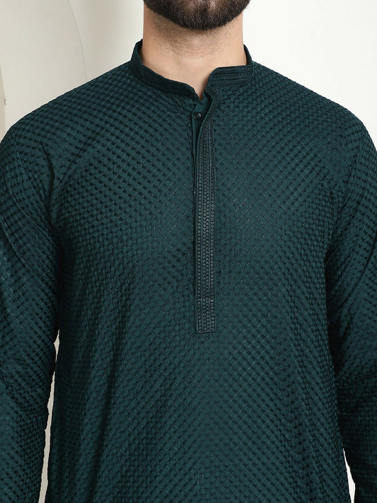 Green Geometric Embroidered Men’s Kurta – Mandarin Collar, Pure Cotton, Knee-Length | Indiaista