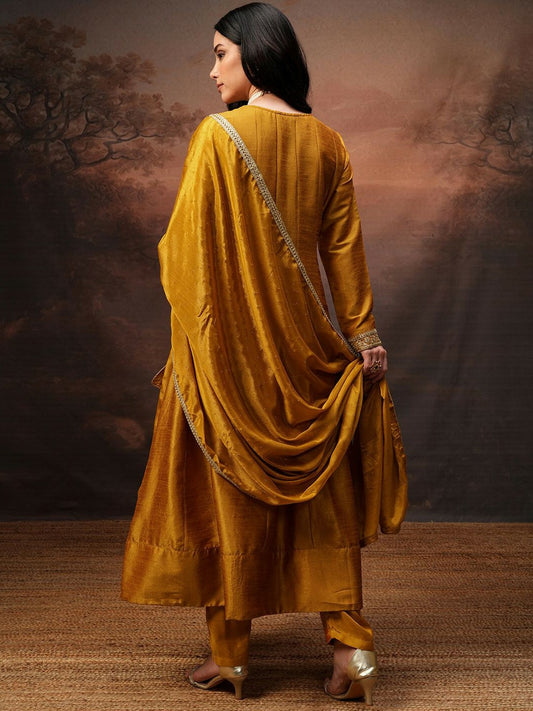 Mustard Yellow Floral Embroidered Kurta Set for Women – A-Line Kurta with Trousers & Dupatta | Indiaista