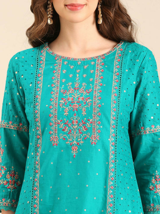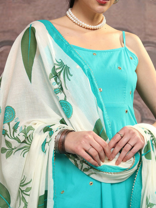 Teal & White Floral Mirror Work A-Line Kurta with Palazzos