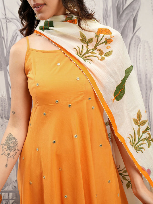 Buy Women Orange & Cream Embroidered Mirror Work Kurta Set with Trousers & Dupatta - Pure Cotton | Indiaista.com