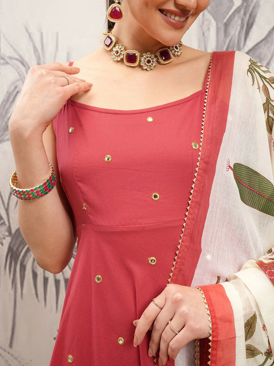 Buy Women’s Rust Embroidered Anarkali Kurta Set with Trousers & Dupatta | Pure Cotton | Mirror Work | Indiaista