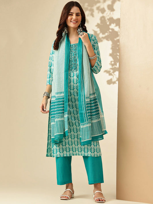 Buy Women Turquoise Blue Embroidered Straight Kurta Set with Palazzo & Dupatta | Indiaista