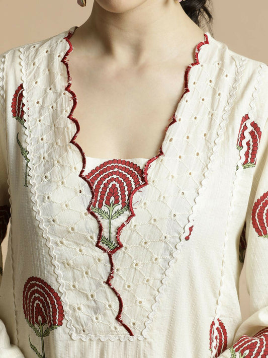 Women’s White Floral Embroidered Pure Cotton Kurta Set with Trousers & Dupatta - Anarkali Style | Indiaista